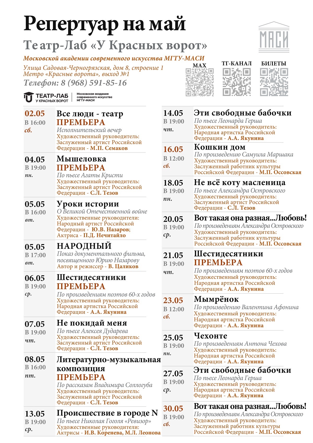 Учебный театр МГТУ-МАСИ и Театр-Лаб «У Красных ворот» Московской академии современного искусства приглашают зрителей отправиться в увлекательное путешествие по РЕПЕРТУАРУ МАЯ!
