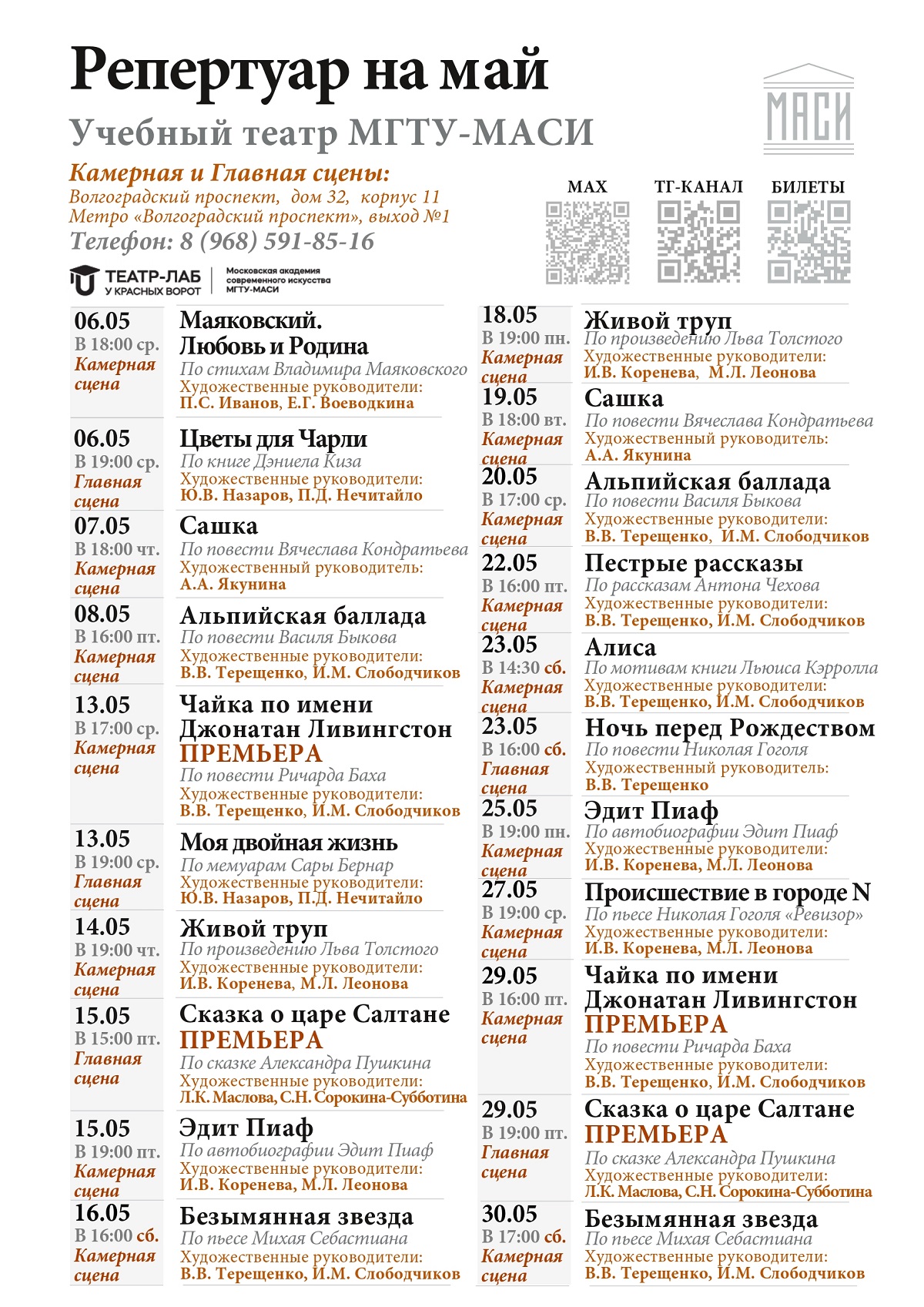Учебный театр МГТУ-МАСИ и Театр-Лаб «У Красных ворот» Московской академии современного искусства приглашают зрителей отправиться в увлекательное путешествие по РЕПЕРТУАРУ МАЯ!