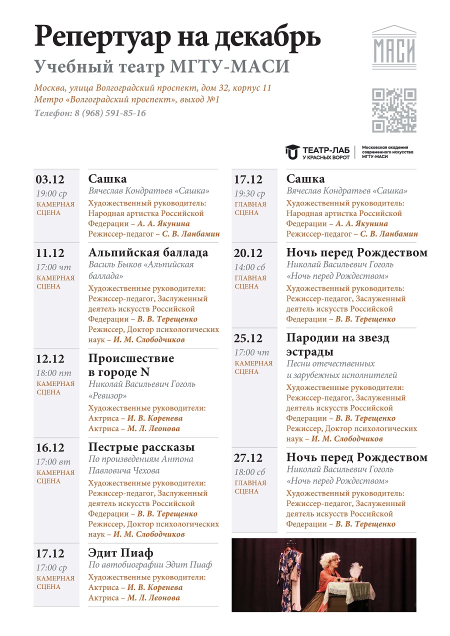 Учебный театр МГТУ-МАСИ приглашает зрителей окунуться в невероятную театральную атмосферу и посетить спектакли в исполнении студентов Московской академии современного искусства МГТУ-МАСИ под руководством кафедры «Театрального и эстрадного искусства».