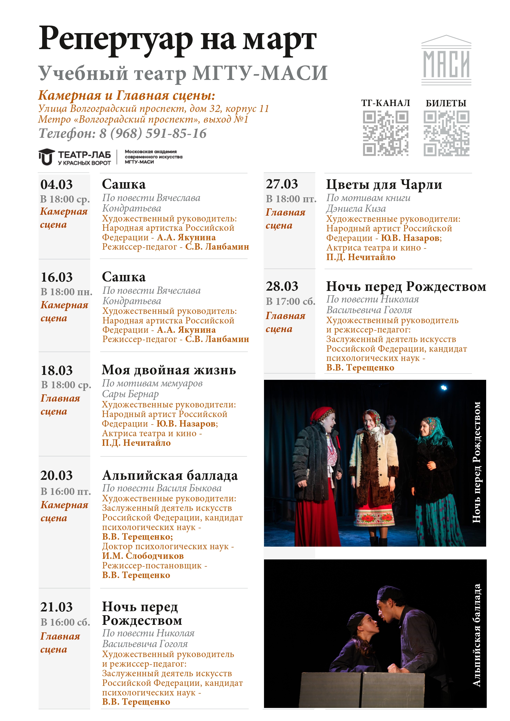 Премьеры, сказки, знакомые с детства или со школьной скамьи сюжеты, глубокие размышления о вечном и самом важном — ДЛЯ ВСЕЙ СЕМЬИ! Спектакли в исполнении студентов Московской академии современного искусства МГТУ-МАСИ под руководством кафедры «Театрального и эстрадного искусства».