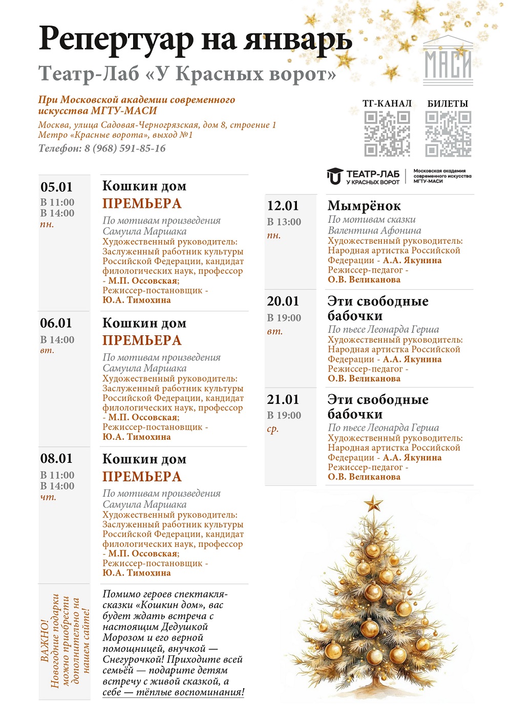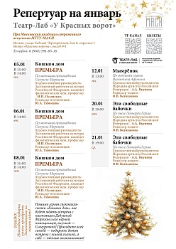 Учебный театр МГТУ-МАСИ и Театр-Лаб «У Красных ворот» при Московской академии современного искусства приглашают зрителей отправиться в сказочное, творческое и искреннее путешествие по РЕПЕРТУАРУ ЯНВАРЯ!