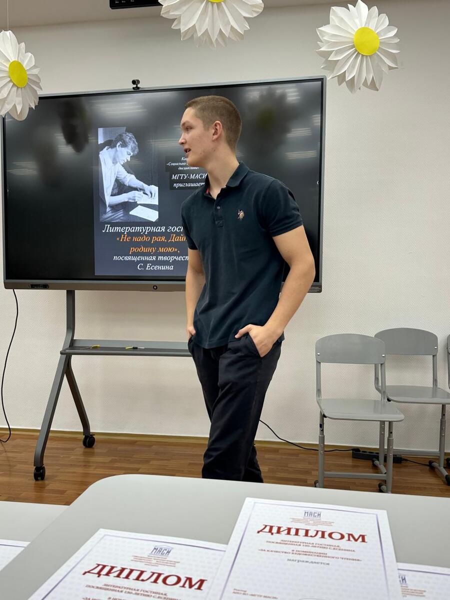 5 октября 2025 года состоялась литературная гостиная «Не надо рая, Дайте родину мою», посвященная 130-летию со дня рождения Сергея Есенина. Более 30 студентов колледжа и вуза МГТУ-МАСИ декламировали и хорошо известные стихи поэта, и малоизвестные его произведения. Формат этого мероприятия позволил позрузиться в творчество поэта и передать многогранность его таланта, трагизм и красоту судьбы поэта.