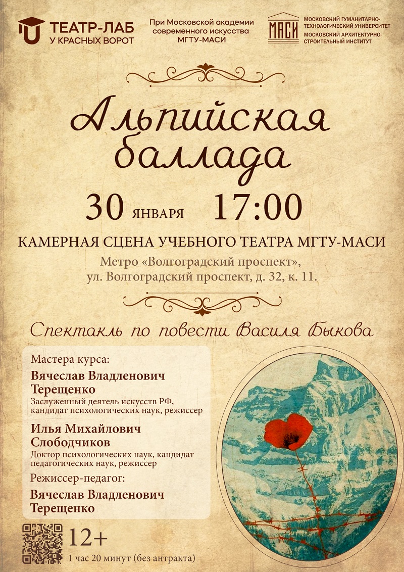Спектакль Учебного театра МГТУ-МАСИ, поставленный по повести Василя Быкова «Альпийская баллада», рассказывает о трех днях из жизни бежавших из немецкого концлагеря Ивана (советский солдат) и Джулии (итальянская девушка) в Альпах во время Второй мировой войны. Спектакль поднимает темы человеческой стойкости, самопожертвования, любви в нечеловеческих условиях и силы духа.