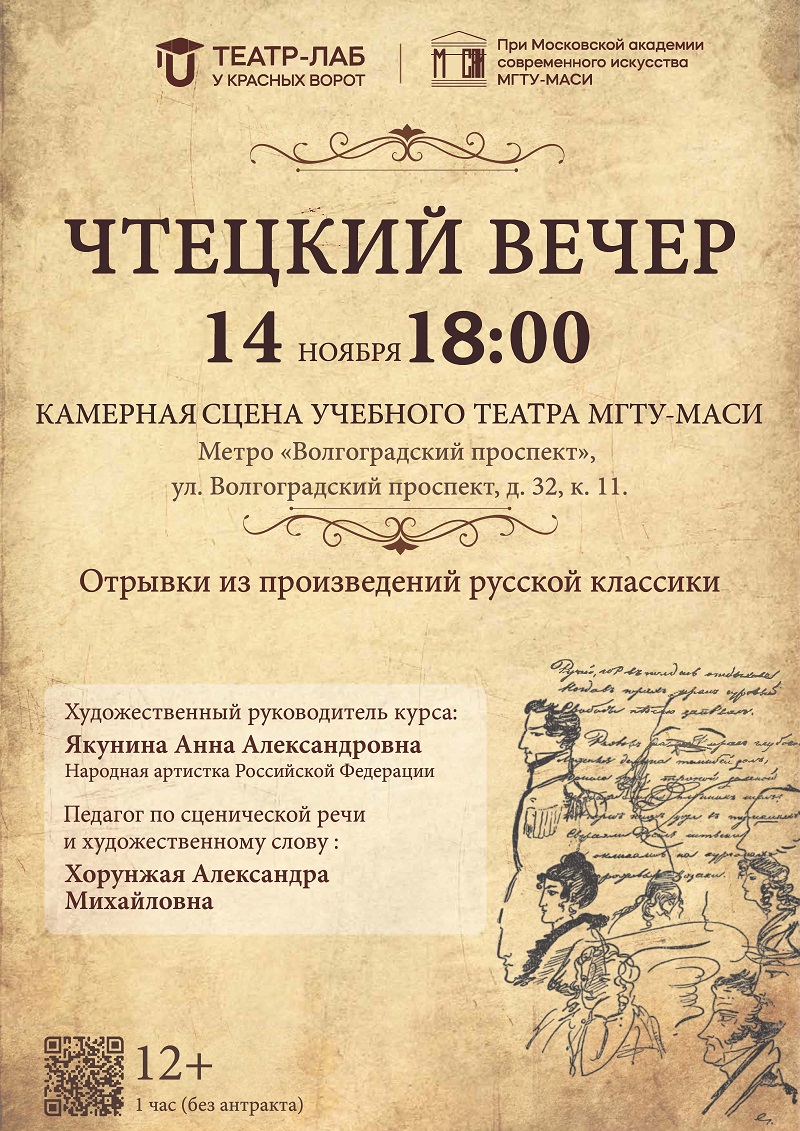 Чтецкий вечер, созданный в стенах Учебного театра МГТУ-МАСИ, представляет собой исполнение литературных отрывков и стихотворений русских классиков.