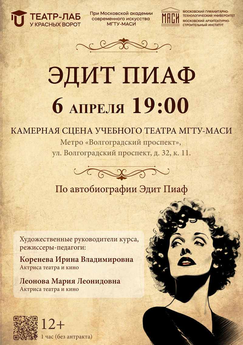 Спектакль об Эдит Пиаф повествует о жизни и творчестве легендарной французской певицы и киноактрисе, рассказывая о её взлетах и падениях, любви и потерях, внутренней силе и стойкости перед лицом судьбы. В спектакле звучат её знаменитые песни, а сюжет строится на основе её биографии, книг и мемуаров, воссоздавая атмосферу эпохи и раскрывая личность великой и всемирно известной певицы.