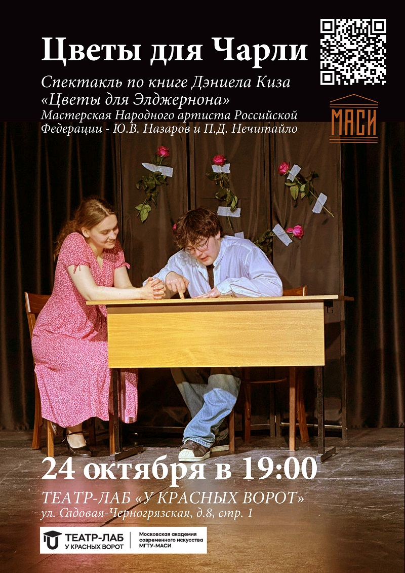 Спектакль, поставленный по мотивам книги Дэниела Киза «Цветы для Элджернона», рассказывает историю Чарли Гордона, умственно отсталого уборщика пекарни, который соглашается на экспериментальную операцию по повышению интеллекта, параллельно проведённую над мышью Элджерноном. Спектакль исследует темы человечности, одиночества, этики научных экспериментов и отношения общества к людям с особенностями, поднимая вопросы о том, что делает человека человеком, и какую цену можно заплатить за гениальность.